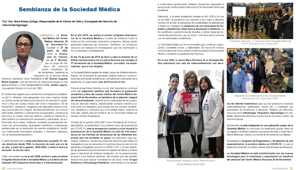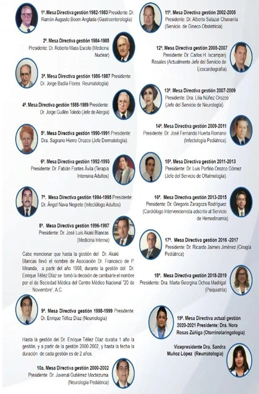 La historia de la Sociedad Médica del Centro Médico Nacional se remonta al 27 de enero de 1982, cuando fue fundada la Asociación Dr. Francisco de P. Miranda, por un grupo de médicos del entonces Centro Hospitalario "20 de Noviembre", mediante la integración de la primera Mesa Directiva, quedando como Presidente: Dr. Ramón Augusto Boom Anglada, Jefe del Servicio de Gastroenterología en esa época (finado), Vicepresidenta: Dra. Julieta Laguna, Secretario: Dr. Miguel Ángel Garcés de León, Tesorero: Dr. Jorge Guillén Toledo, Vocal de Pediatría Dr. Enrique Abogado Rodríguez, Vocal de Cirugía: Dr. Raúl A. Villalba Posada, Vocal de Medicina Crítica: Dr. Fabián Fontes Ávila, Vocal de Diagnóstico: Dr. Severino Tarasco Camino, Vocal de Extensión Hospitalaria: Dr. Fernando de la Torre Martín del Campo (finado), Vocal de Medicina Interna: Dr. Julián Medina Martínez (finado), Vocal de Gineco- Obstetricia: Dr. Luis Miguel Topete Orozco, cuya gestión finalizó en enero de 1983